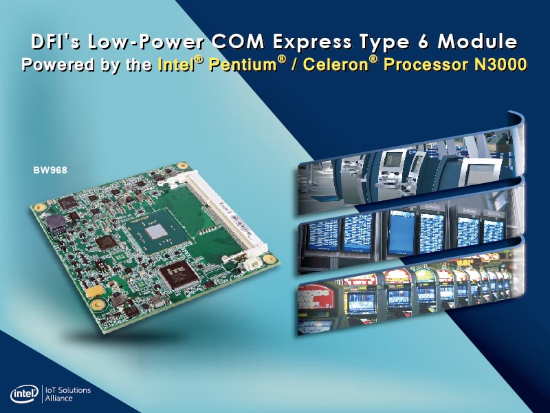 在嵌入式產品於各種工業應用上居領導地位的友通資訊,推出一款搭載Intel®Pentium®/Celeron® 處理器 N3000的COM Express Type 6 Compact 嵌入式電腦模組 - BW968。 與前一代的處理器相比,這款嵌入式電腦模組最大的特色為,在4-6瓦的低功耗下仍可支援3個高像素的獨立顯示器,專為入門款的博弈機台、售票機、自動櫃員機及數位看板等工業應用所打造。